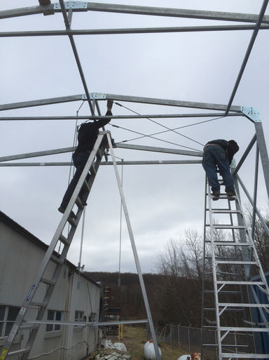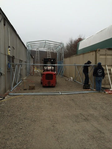 A.C.E. Structures manufactured and installed a Fixed steel and fabric structure for Farren International in Randolph New Jersey. This structure measures 18' wide x 60' long x 16' height. Farren chose a Kopron structure instead of a traditional brick and mortar building, for its PVC cover, which is a special insulated material for additional warehouse space.